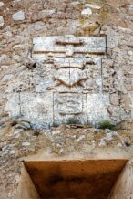 Sobre la puerta de acceso un escudo de armas con las cuatro barras de la corona del Reino de Valencia, junto con el águila bicéfala del imperio, y debajo de ellas las armas del duque de Maqueda. Bajo el escudo, en una inscripción sobre un bloque de piedra, podemos leer: «Sub umbra alarum tuarum protegido» (en la sombra de tus alas me protegen) el nuevo poder imperial ha sustituido en la protección del territorio a la anterior autonomía medieval.
