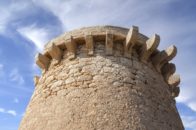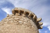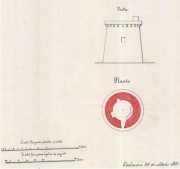 Es cilíndrica de unos 10 metros de base, de cuerpo troncocónico de 10 metros de altura, con la parte superior rodeada por un parapeto con pequeñas ménsulas. Construida en mampostería.